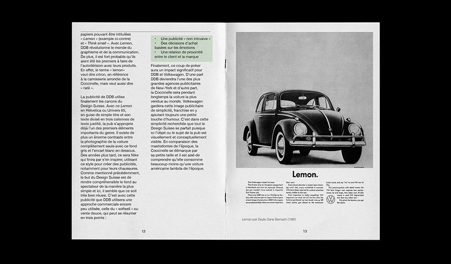 Fanzine sur le courant du design, le Swiss Design. Un fanzine qui offre les clefs de compréhension permettant de savoir comment le Design Suisse à été un précurseur pour le design graphique, autour de l'exemple de Volkswagen et DDB ainsi que divers exemples de travaux contemporains sur le même courant.