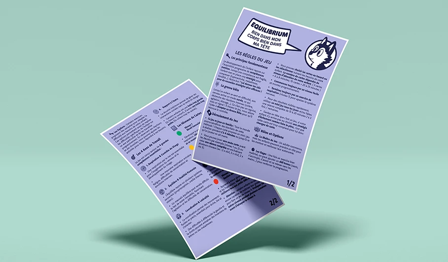 Akela Self Care c'est d'abord le projet de Yann Paillat, réparateur physique, qui à l'aide de son application réduit le stress et améliore le sommeil grâce à une routine de mouvements simples et quotidiens. Basée sur un bilan sensorimoteur, elle propose un accompagnement personnalisé pour rééquilibrer le système nerveux de manière naturelle. Yann avait besoin de créer une identité visuelle pour son projet et c'est par la suite qu'une nouvelle idée a ressurgi, celle de créer un jeu de carte en rapport avec cette identité qui servirait d'outil et de support pour les enseignants dans les écoles. Le principe du jeu est d'offrir aux enseignants ou aux parents une possibilité d'allier jeu et réparation physique, comme l'appelle Yann.