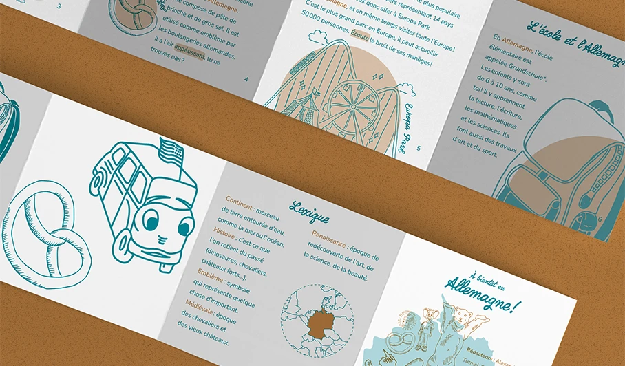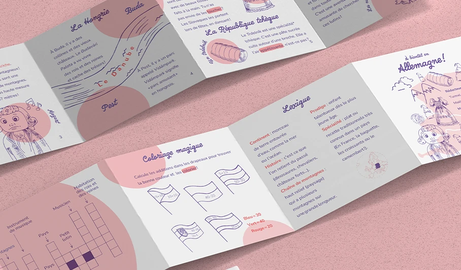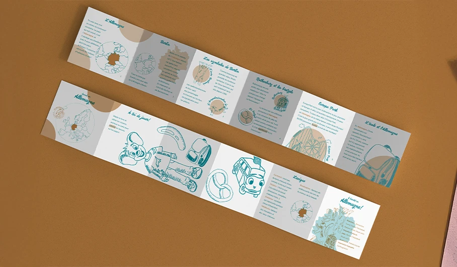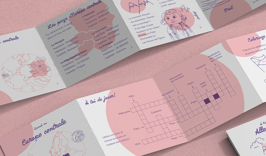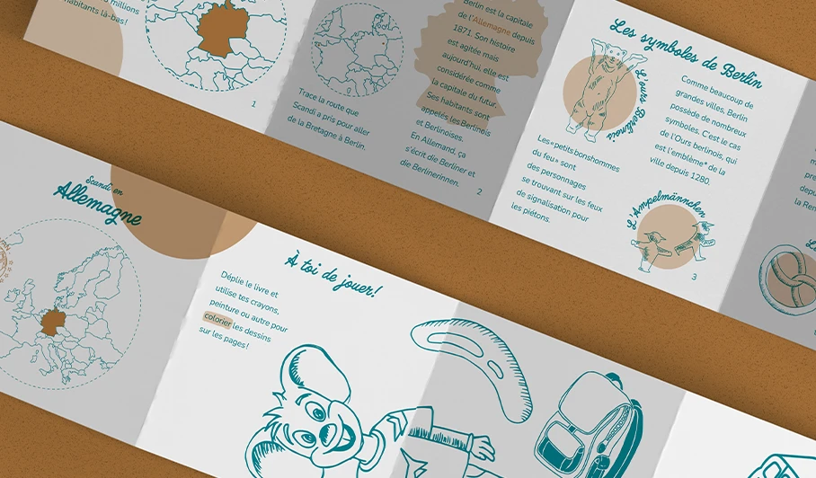 Les éditions de Scandi proviennent d'un voyage culturel d'Alexandrine Turmel et son compagnon dans diverses écoles d'Europe. De ces échanges en résultera ces carnets pédagogiques. Notre but était de rendre ces carnets imprimés en risographie, une méthode d'impression, sur le format de notre choix, ici celui du leporello. Pour les 6 à 9 ans, les carnets offrent une petite histoire du pays, diverses informations, des anecdotes, faits historiques ou culturel. Pour le côté plus ludique, on retrouvera également des activités comme des coloriages ou des recettes de cuisine.